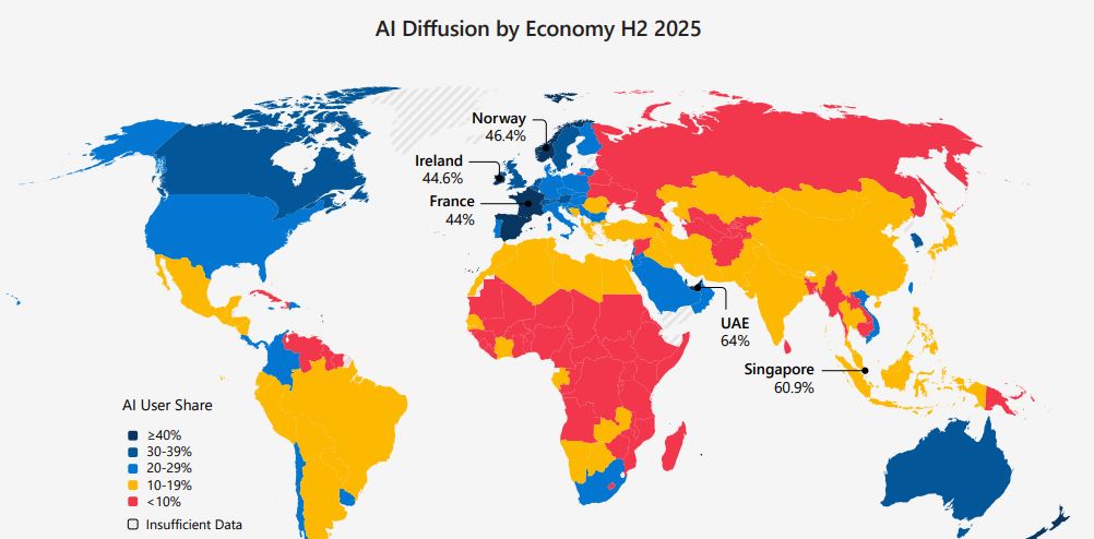 👩🏻💻Компания Microsoft выпустила отчёт, посвящённый глобальному внедрению искусственного интеллекта в 2025 году. В документе представлены показатели проникновения ИИ‑технологий по странам. Помимо лидера рейтинга, в первую пятёрку вошли Сингапур с уровнем внедрения 60,9 %, Норвегия — 46,4 %, Ирландия — 44,6 % и Франция — 44 %.