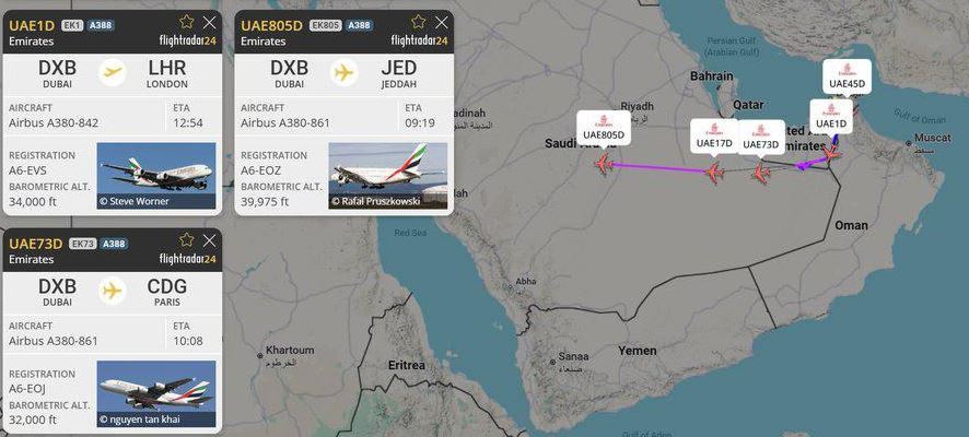 Среди направлений, куда сегодня утром отправились эти воздушные гиганты, — Джидда, важный религиозный и деловой центр Саудовской Аравии; Манчестер, один из крупнейших городов Великобритании; а также ключевые европейские столицы и авиахабы: Париж, Лондон и Франкфурт.