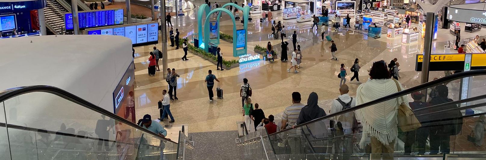 По данным на 11:10 мск (12:10 по местному времени), на онлайн-табло аэропорта появились сведения об открытой регистрации на ряд рейсов компании Etihad Airways. Среди направлений — Амстердам, Лондон, Париж и Москва. Первый рейс в российскую столицу был запланирован на 14:30 по местному времени (13:30 мск). Его должна была выполнить авиакомпания Etihad Airways на самолёте Boeing 787. Предполагалось, что борт прибудет в Шереметьево в 21:43.